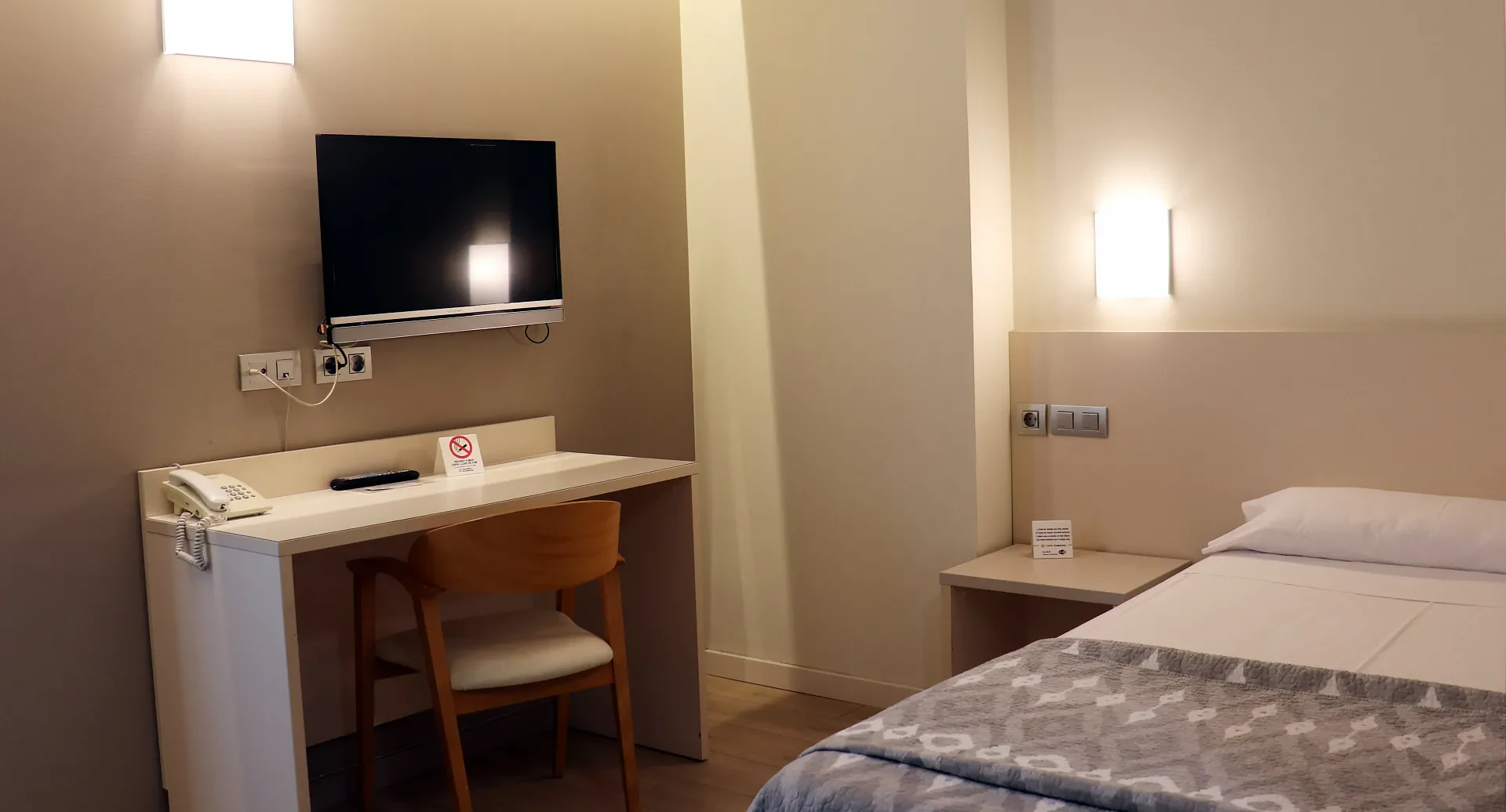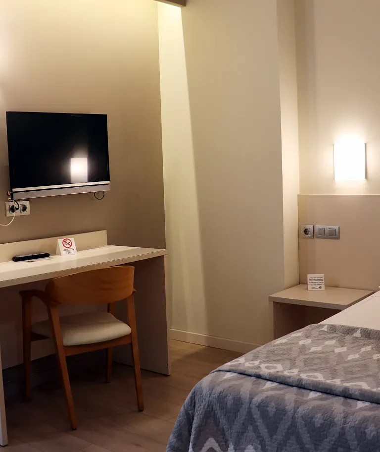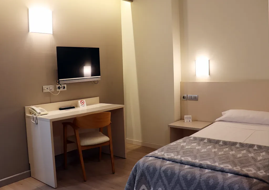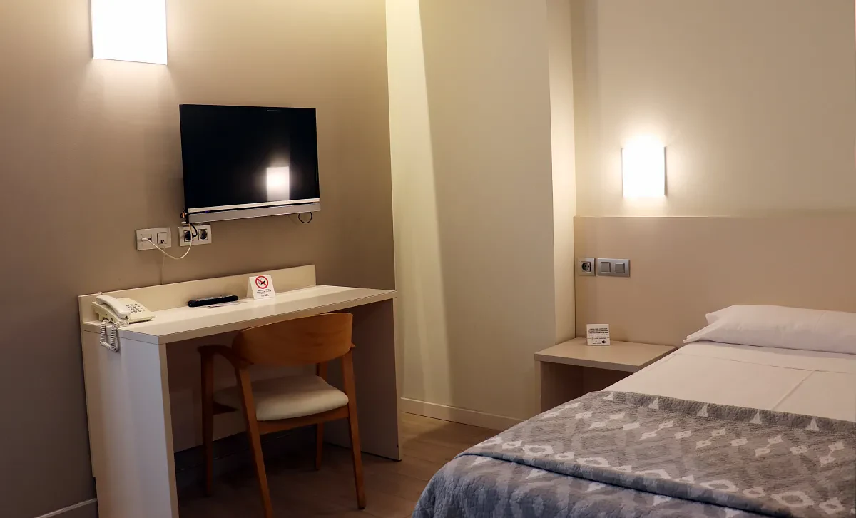 Pensada para quienes viajan solos y buscan tranquilidad, la habitación individual del Hotel Tramuntana ofrece todo lo necesario para un descanso reparador. Con una cama cómoda, aire acondicionado, calefacción y baño privado, este espacio combina funcionalidad y confort en un ambiente moderno y acogedor.